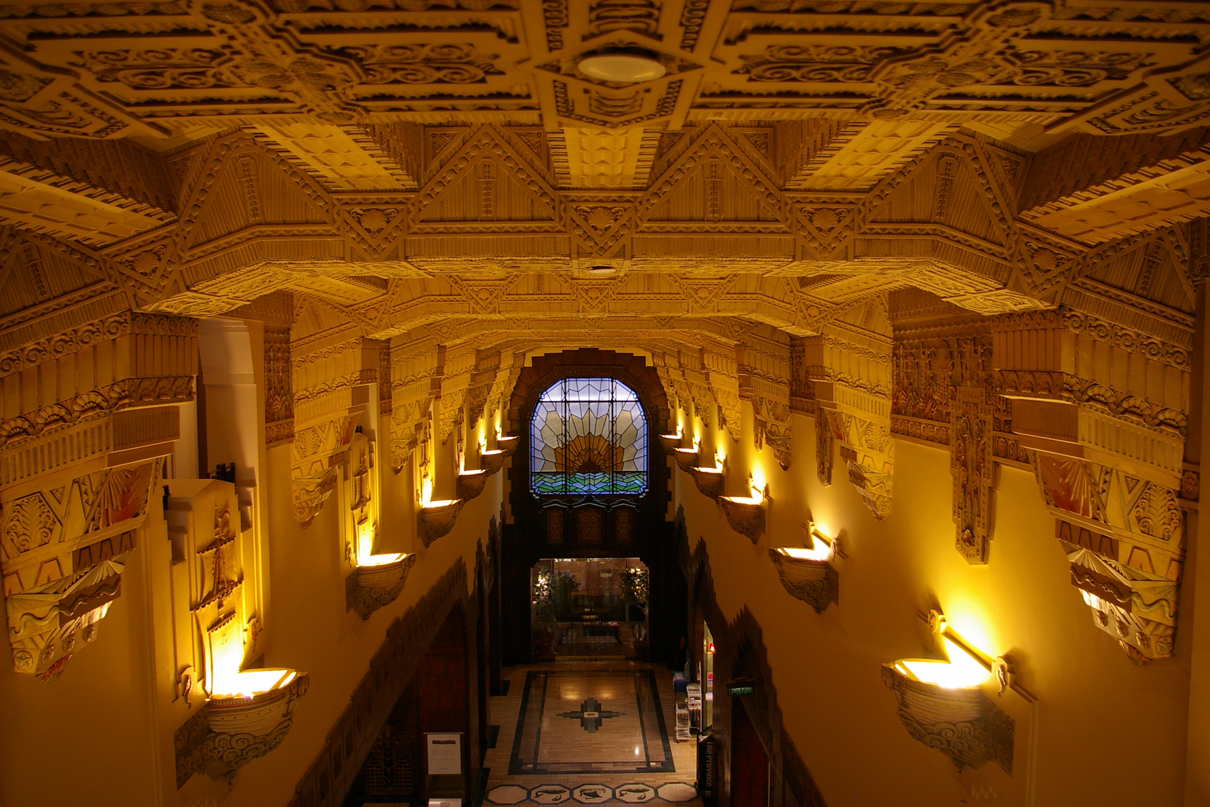 The flood of decoration continues inside the two-storey lobby, whose ornately bracketed ceiling is illuminated by sconce lights hidden behind protruding ship prows. The original lobby floor, featuring battleship linoleum from Scotland, has been replaced by a terrazzo floor with large astrological symbols, but the metal elevator doors bearing bas-relief marine motifs are still intact.